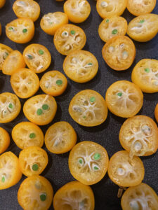 - 金柑を半分に切って種を取る