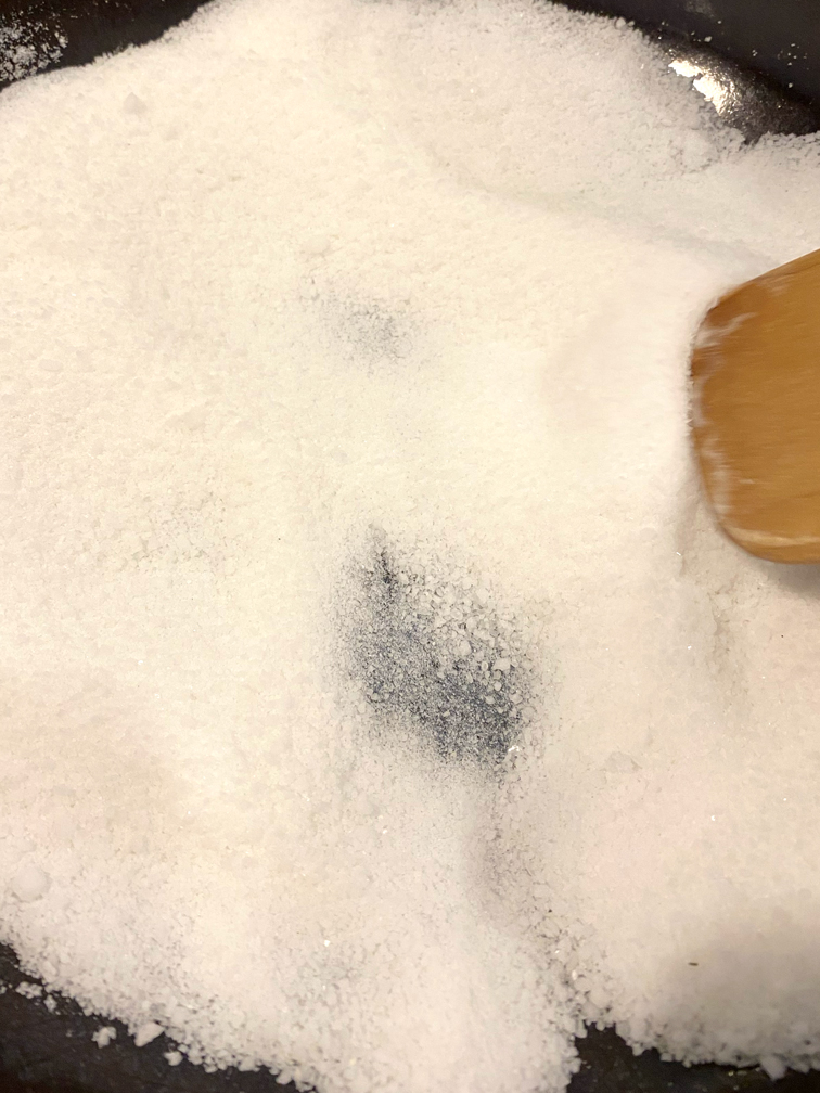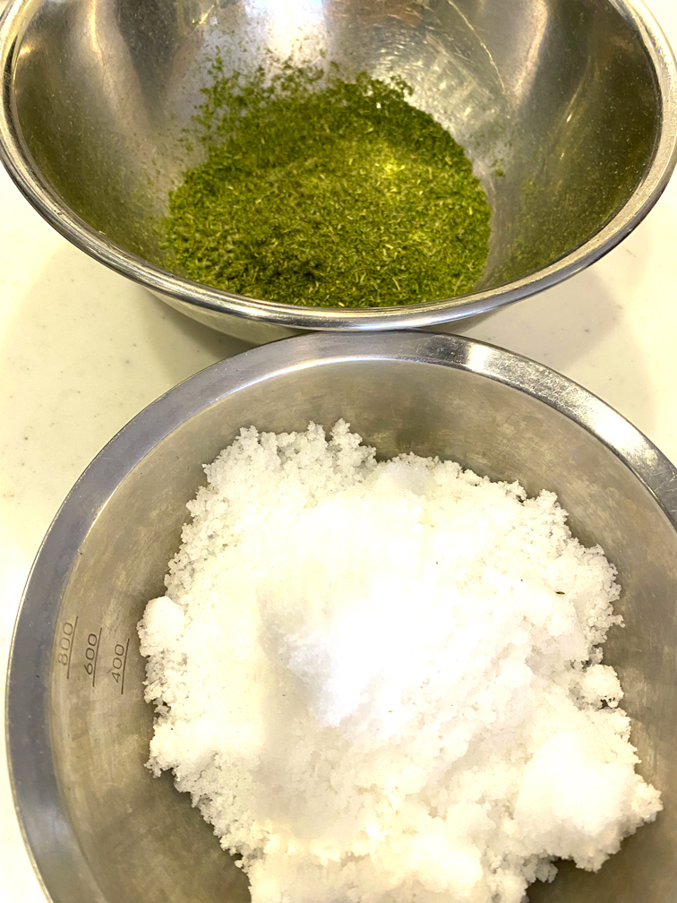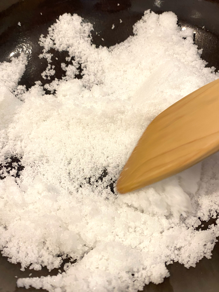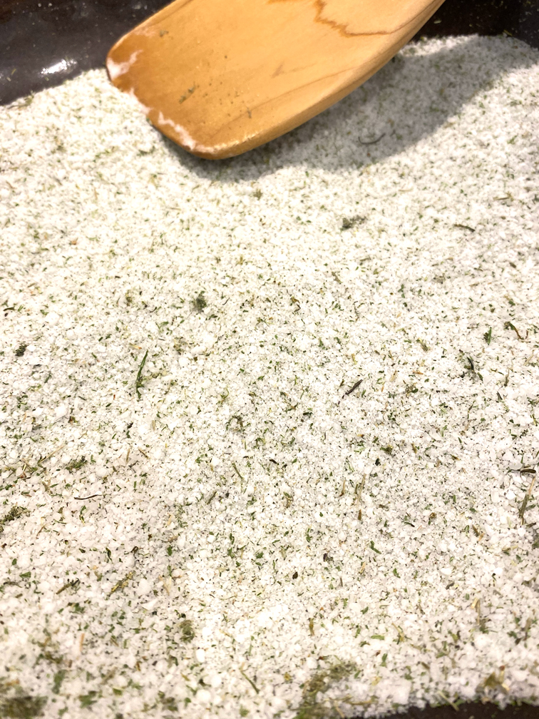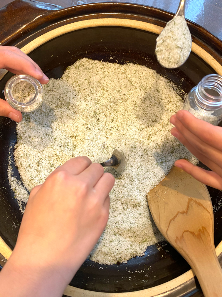 水分を含んで固まっていた塩が、サラサラになります。(写真参照) - 火を止めてから、野草を入れて混ぜ合せます
